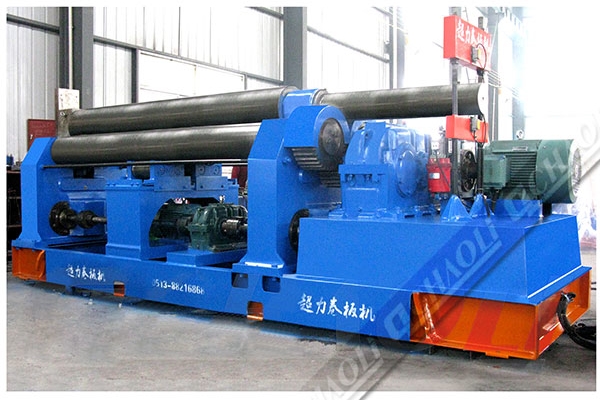 本機結構型式為三輥對稱式,上輥在兩下輥中央對稱位置作垂直升降運動,通過絲桿絲母蝸桿傳動而獲得,兩下輥作旋轉運動,通過 減速機的輸出齒輪與下輥齒嚙合,為卷制板材提供扭矩。本機床的缺陷是需借助其它設備實現(xiàn)預彎。本設備可卷板厚1mm-40mm,板寬8000mm的板料。